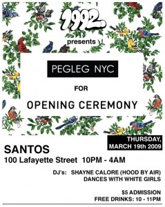 come one, come all…and celebrate PEGLEG’S new private line launch with OPENING CEREMONY (who recently did a private line with CHLOE SEVIGNY – “big tings agwan”). 1992 are your hosts for the evening. it’s 5$ entry, but there will be…