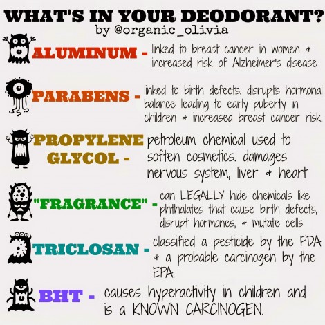 Well, we as a society is probably not as smelly or sweaty as we are told. I have found – with my new deodorant, I only need to wear it like once a week – if that! The bacteria I had issues with, are no longer a problem for me. If sweat and bacteria are an issue for you, it could be potentially something internally going on that could be explored instead of trying to cover with a nicely scented band-aid. Maybe excessive sweat is due to an emotional or physical condition that could result in a terrible disease but we will never know because we are avoiding the culprit. Or that funky bacteria could be a result of a bad diet that is also giving you heart burn or IBS and could potentially, if continued to be overlooked, could become an ulcer or worse. Again, my thought process could be seen as insane and I realize that sometimes you just need that nicely scented band-aid because you still have to live your life. Believe me, I took the hard road – got caught out there and funked up my personal spaces. But when I learned to give up on what other people thought of it me, it eventually helped me in the overall of improving my health. Just saying, maybe worth giving it a try.