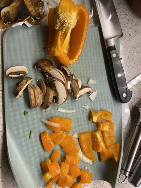 I started on the fake Chorizo for the ?. I don’t eat soy and these Trader Joe’s Sausage-Less Sausage have soy and maybe some dairy. We had some mushrooms, garlic, bell pepper and onions which I threw into the mix.