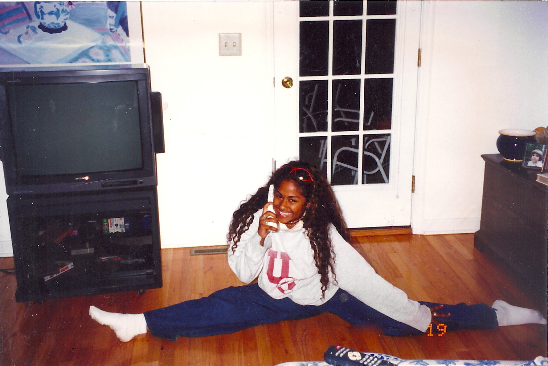 (Me talking to my high school boyfriend CHRIS on the phone while spending the night at my friends house in the ‘burbs rocking  her soccer sweats.)